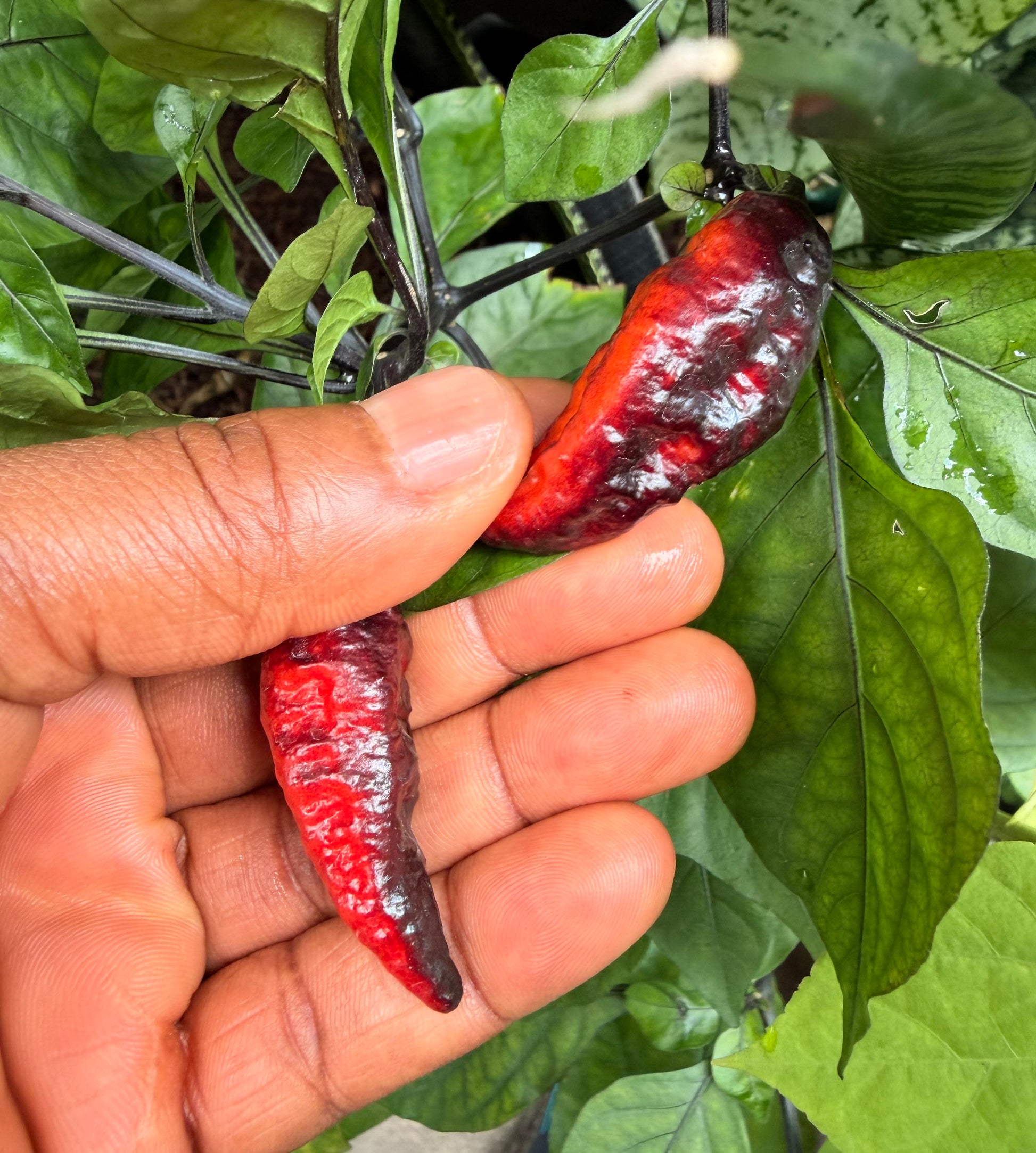 This pepper starts out almost black and ripens to a a beautiful red with hints of black that look like they were charred.